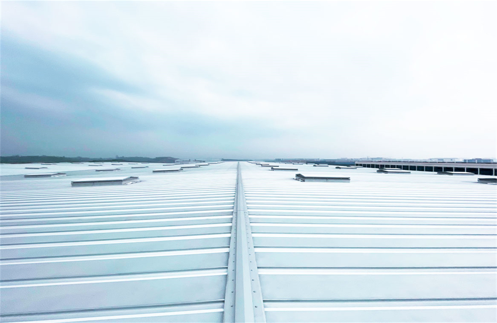 In the three monomers constructed by wiskind, the single building area of the 1# final assembly workshop is 20598.40 square meters, the building height is 17.85m, and the roof structure is composed of a single span length of 72m*125m two-span grid structure, which is one of the largest single-span roof grid structure in Zigong City and even Sichuan Province. The roof enclosure adopts SR6® upright lock joint roof system independently developed by wiskind, 450° lock joint, double ridge and four slopes, no parapet wall with color plate hanging gutter. The roof system has obtained the American FM certification test and the Chinese standard static and dynamic wind resistance test, through high-performance sliding supports and lock joints to provide superior wind and waterproof performance, up to the first level of waterproof, to provide more than 360 degrees of comprehensive durable protection for the project.